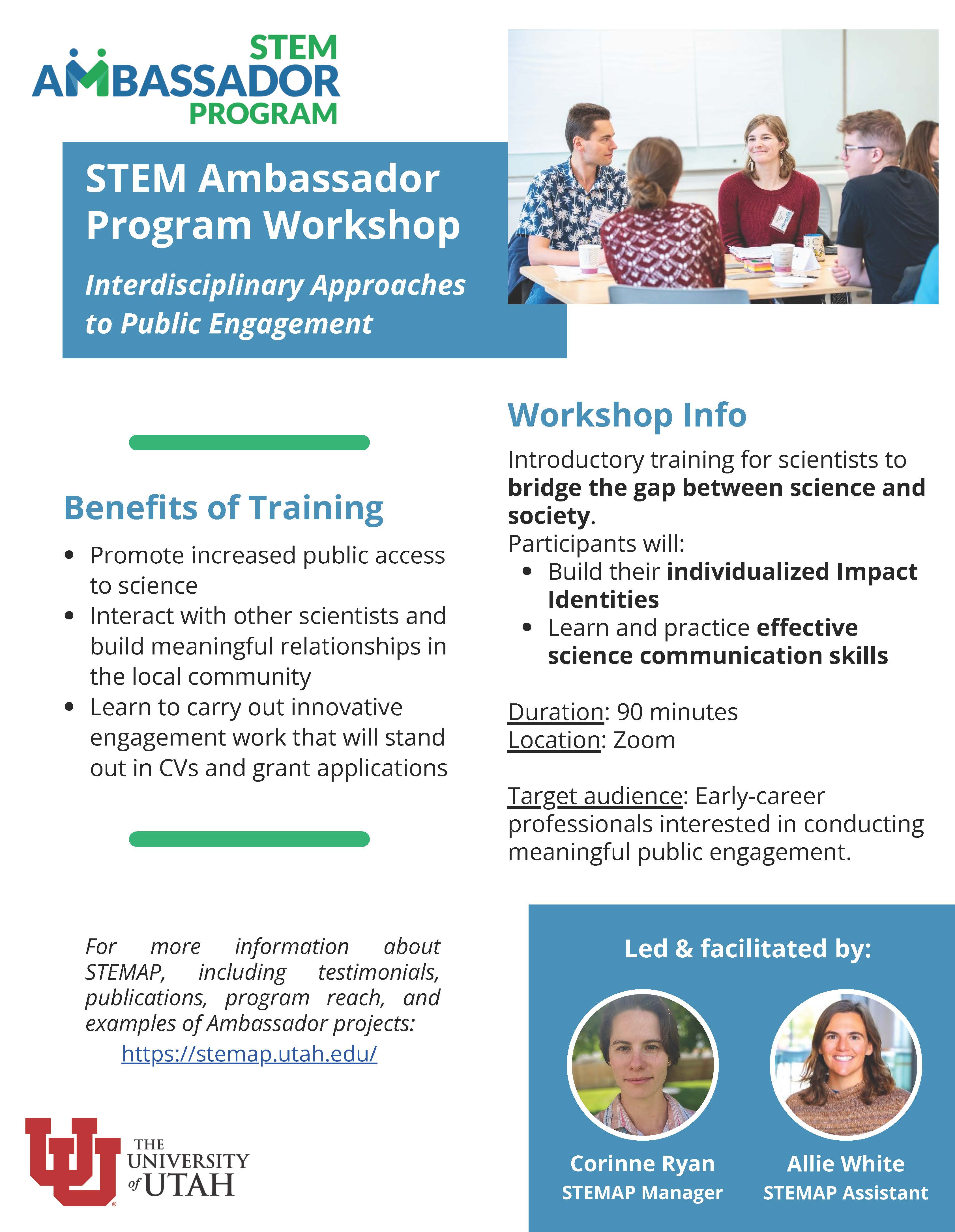 Early career STEM professionals, students, postdocs and other trainees, build your public engagement skills by participating in a free virtual training hosted by Section Y! This 90-minute Zoom workshop, led by expert staff from University of Utah’s STEM Ambassador Program, will help you learn strategies for engaging effectively with your community, lawmakers and other members of the public. The trainer will guide you in determining how you can be most effective at public engagement, by helping you create an individualized “Impact Identity” based on your personal and professional interests, experiences, and backgrounds. See attached flyer for more information. Space is limited to 25 participants so apply soon!
