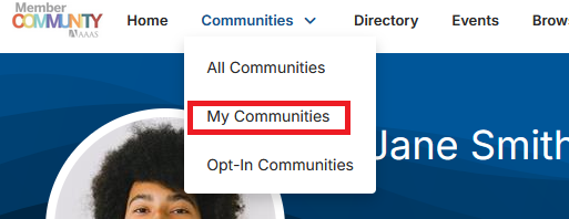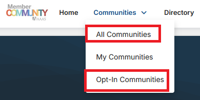 1. On the main page, select "Communities". The dropdown that appears will show the option to see either All Communities for you to view or join or see our Opt-in Communities which we recommend you explore.