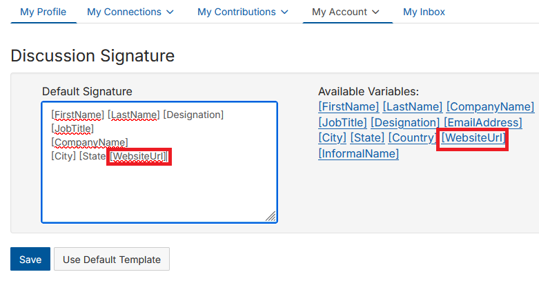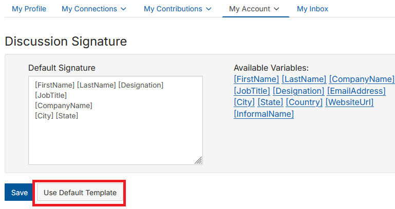 On the Discussion Signature page, you can use the default template, which pulls your First Name, Last Name, Designation, Job Title, Company Name, City and State from what you've entered in My Profile. While we do encourage users to take advantage of the default discussion signature variables, users are welcome to create their own custom discussion signatures with or without the many available variables. Simply delete the variables and insert any text you want.