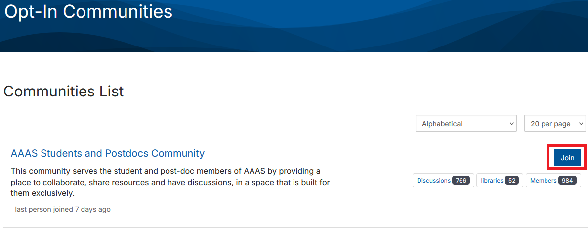 2. The Communities page shows communities to which you already belong and communities which you can join. To Join a community, select "Join" next to the Community name.