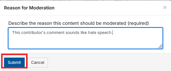 Enter a note which explains why you've marked the comment as inappropriate, then submit.