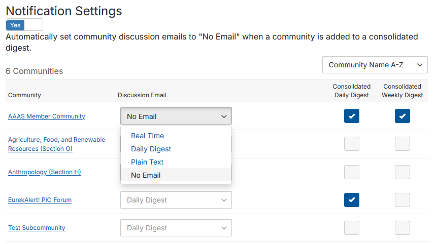 - Consolidated Digest: Allows you to combine multiple communities into one notification email either for a weekly and/or daily delivery.