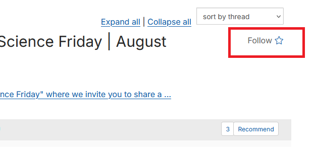 2. On the Discussion Thread page, select the Follow star on the far right to subscribe to thread reply notifications and deselect the Follow star to unsubscribe to reply thread notifications.
