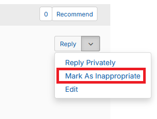 1. Select the dropbdown arrow next to "Reply". Then select "Mark as Inappropriate"